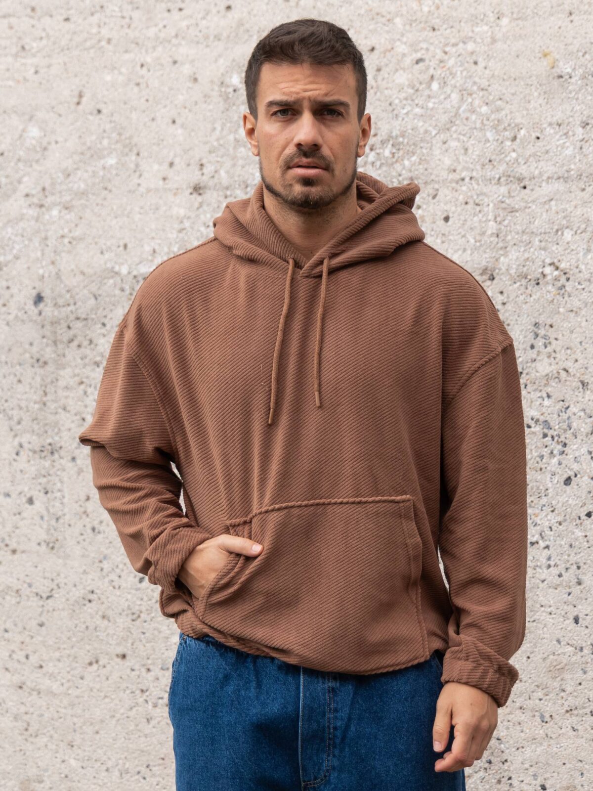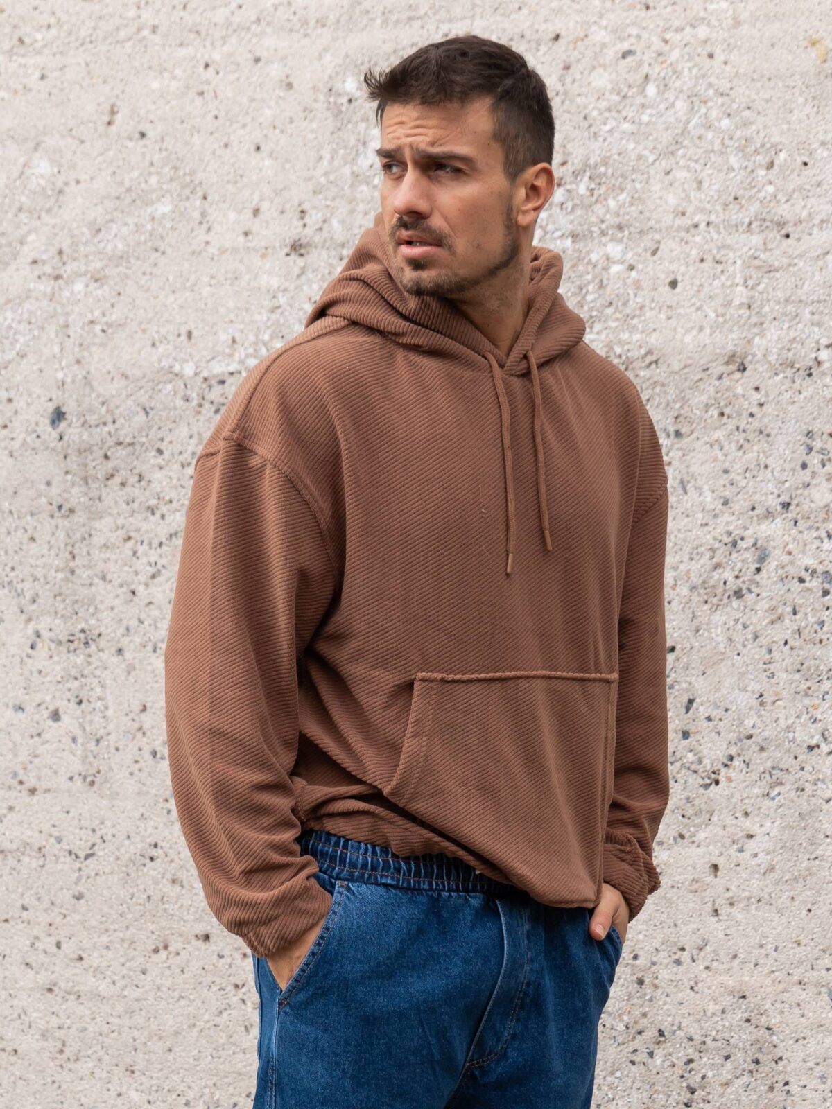 Φούτερ κοτλέ καφέ με κουκούλα σε oversized γραμμή