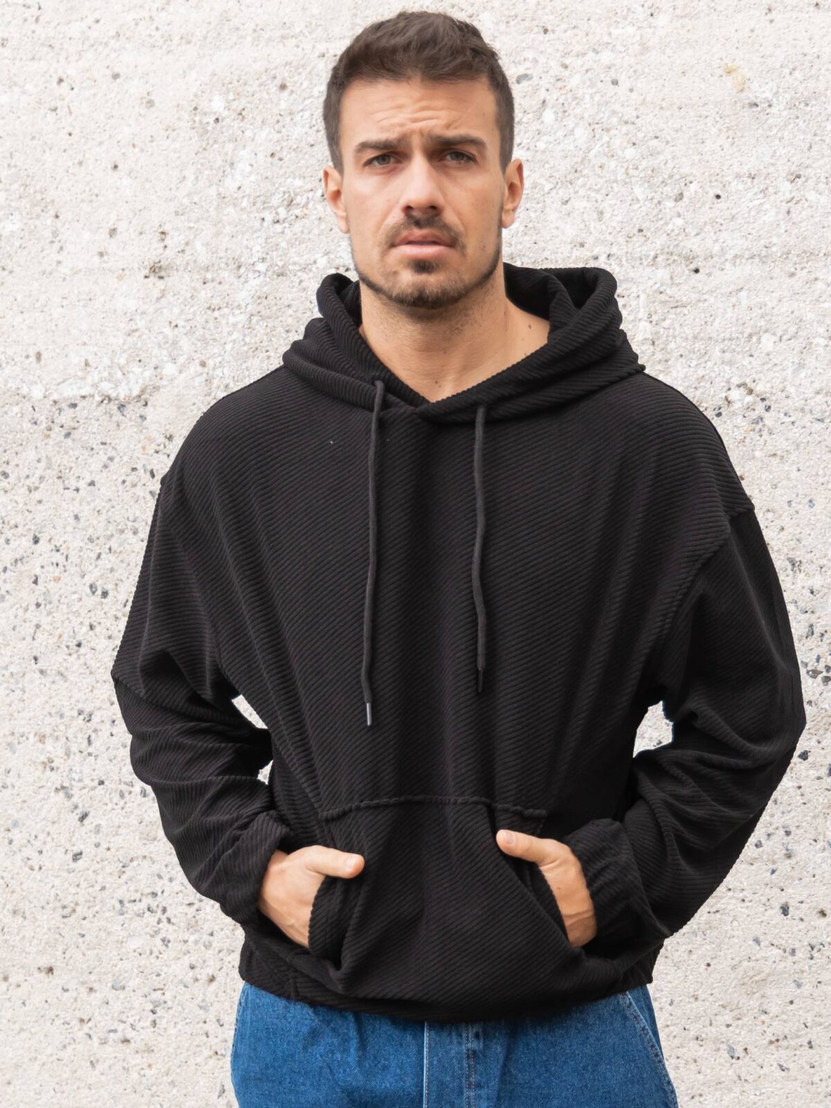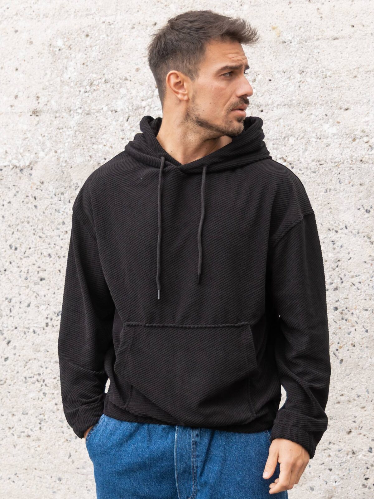 Φούτερ κοτλέ μαύρο με κουκούλα σε oversized γραμμή