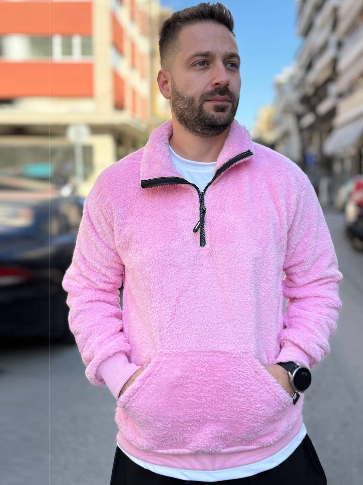 Fleece φούτερ γούνινο ροζ με φερμουάρ σε oversized γραμμή