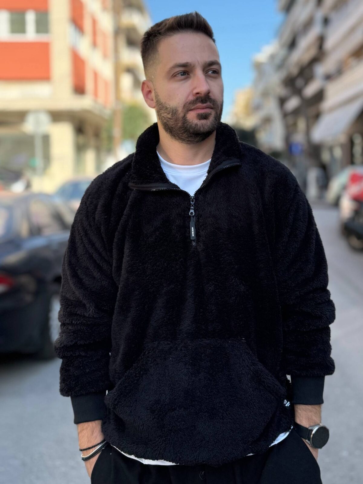 Fleece φούτερ γούνινο μαύρο με φερμουάρ σε oversized γραμμή