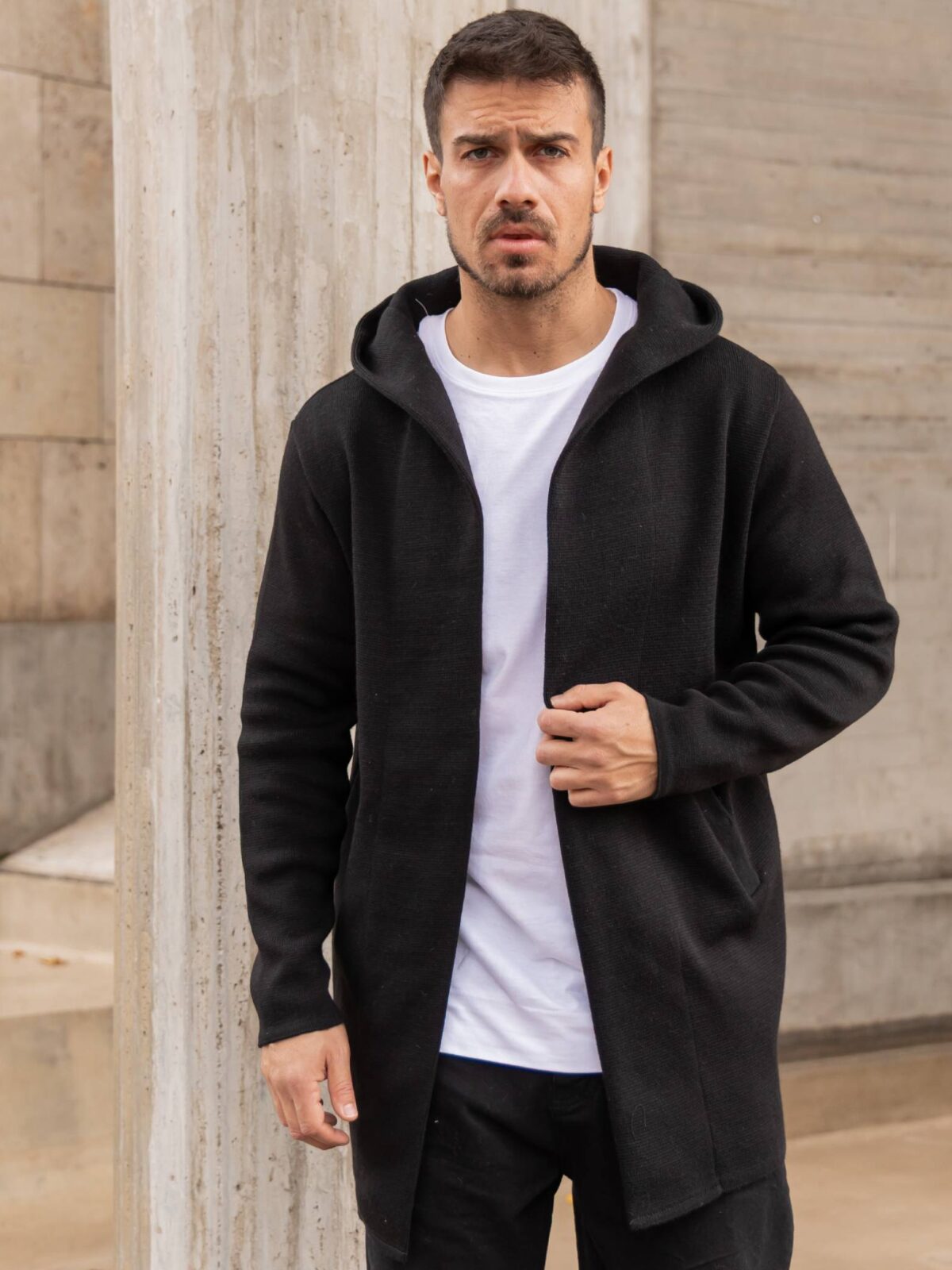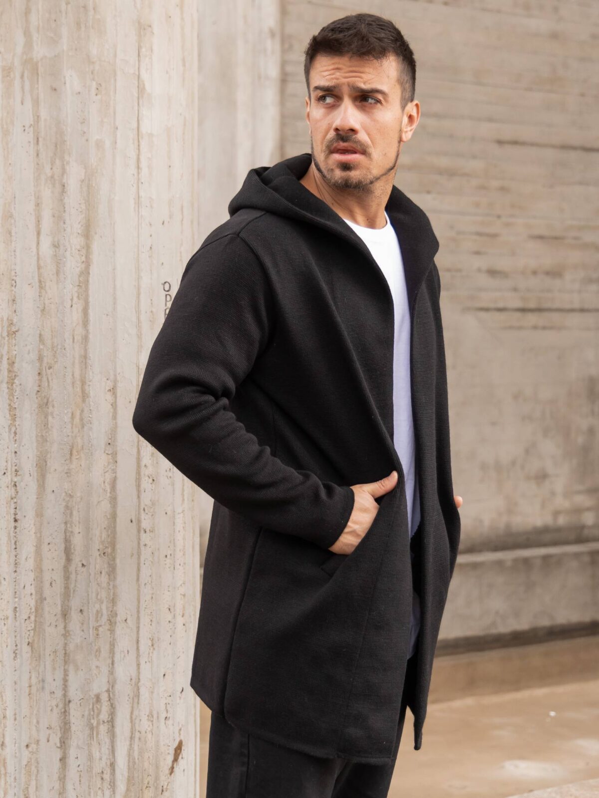 Ζακέτα μαύρη μακριά με κουκούλα σε άνετη γραμμή