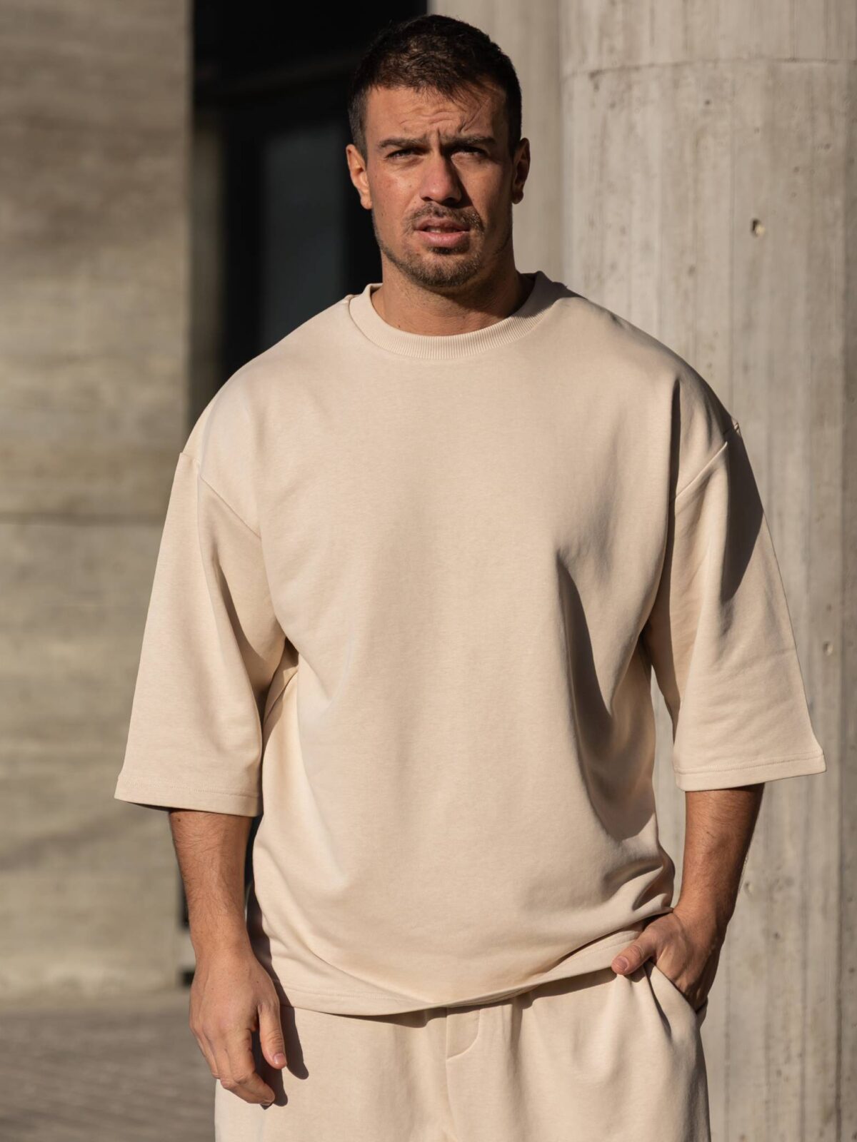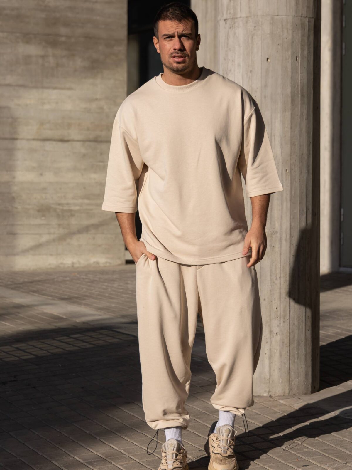 Σετ T-shirt & japaneese baggy φόρμα μπεζ σε oversized γραμμή