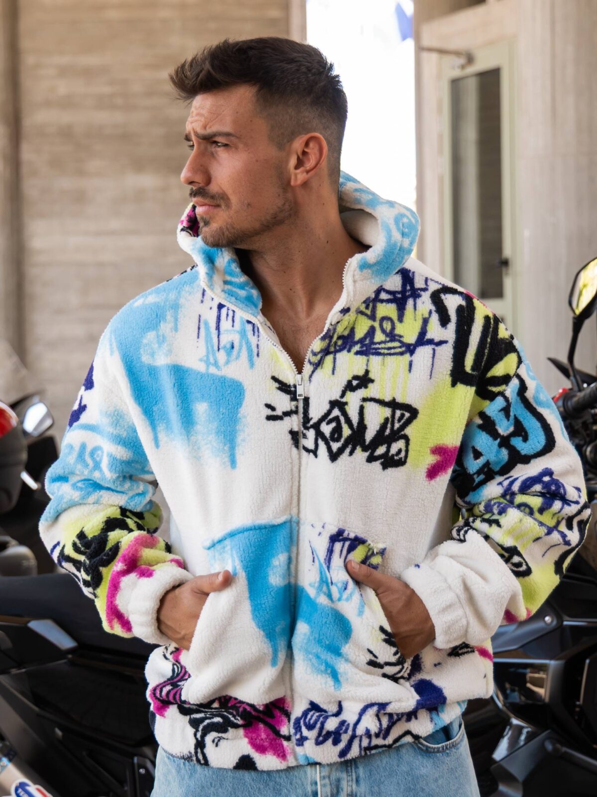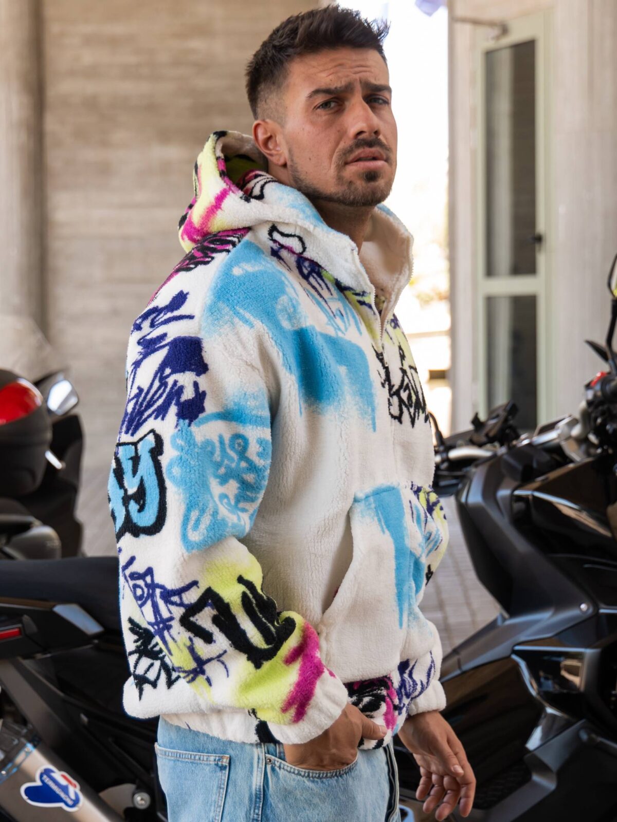 Φούτερ λευκή με κουκούλα με στάμπα σε oversized γραμμή
