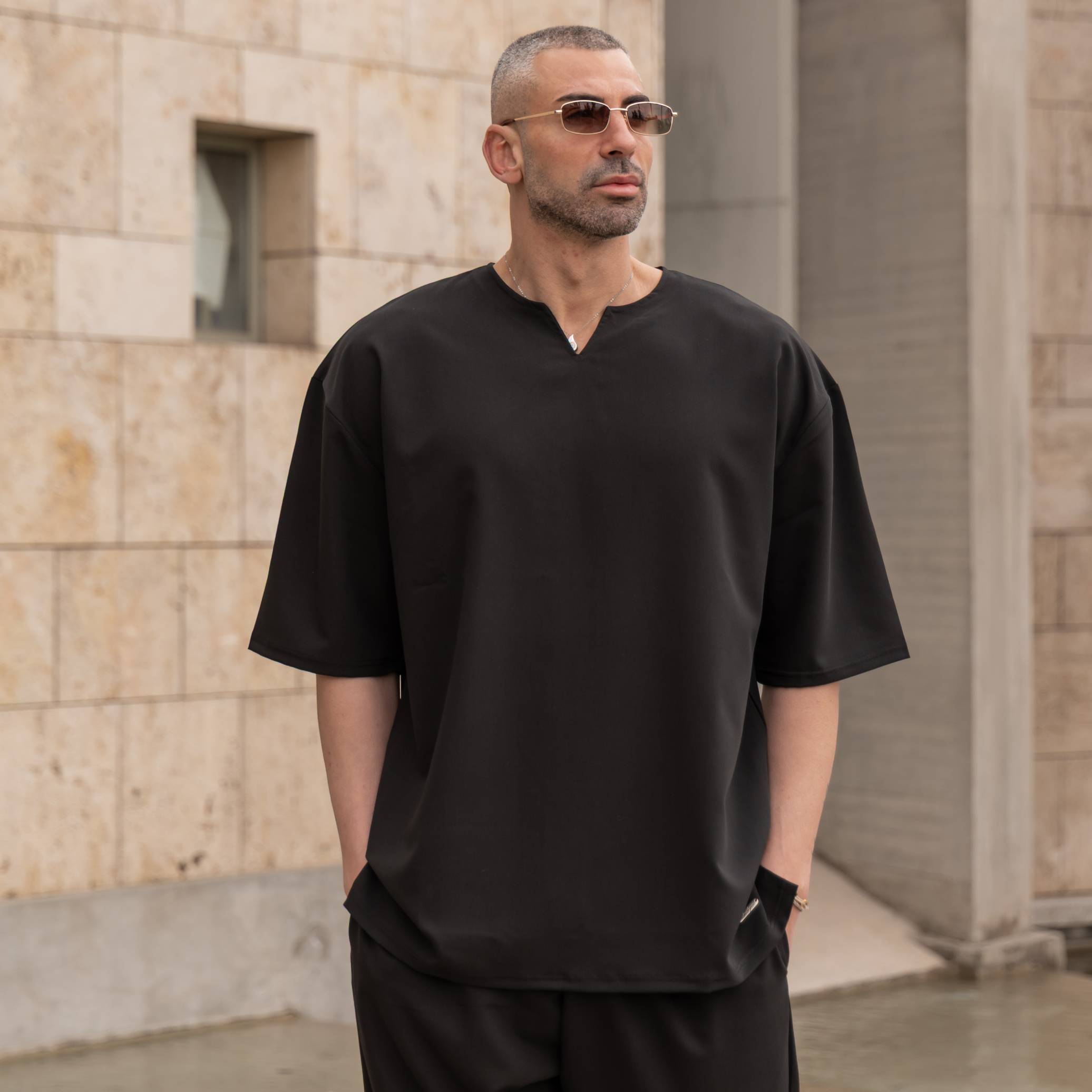 Σετ παντελόνι & πουκάμισο μαύρο μαο με κουμπί σε oversized γραμμή