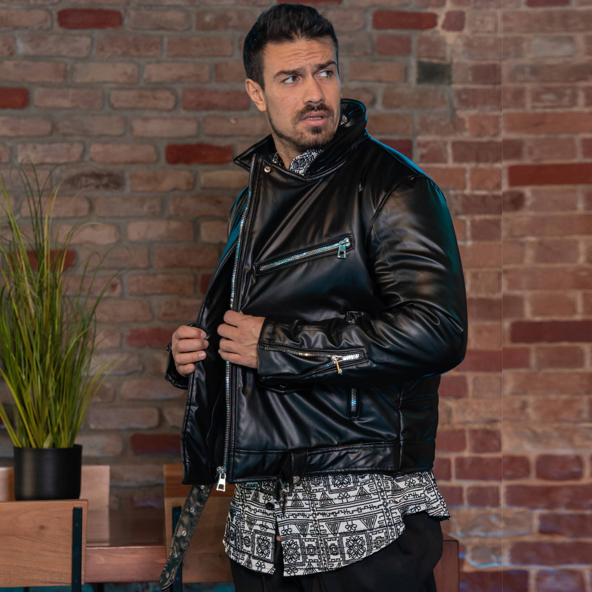 Μπουφάν δερματίνη μαύρο με τρουξ και φερμουάρ σε κανονική γραμμή