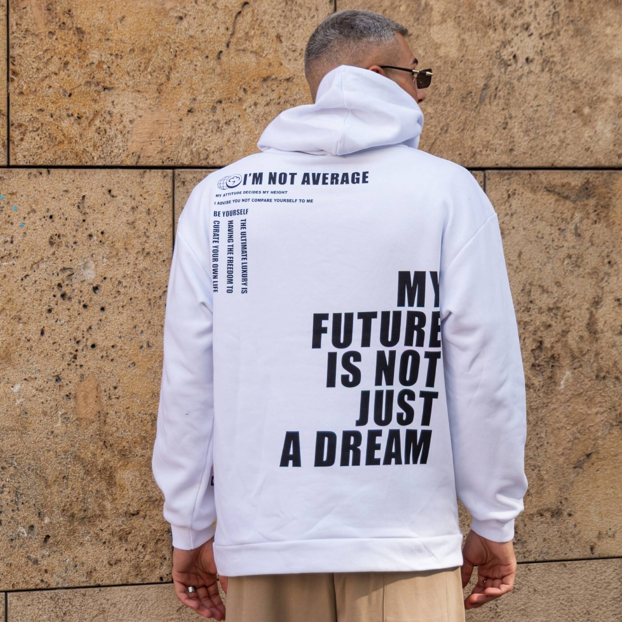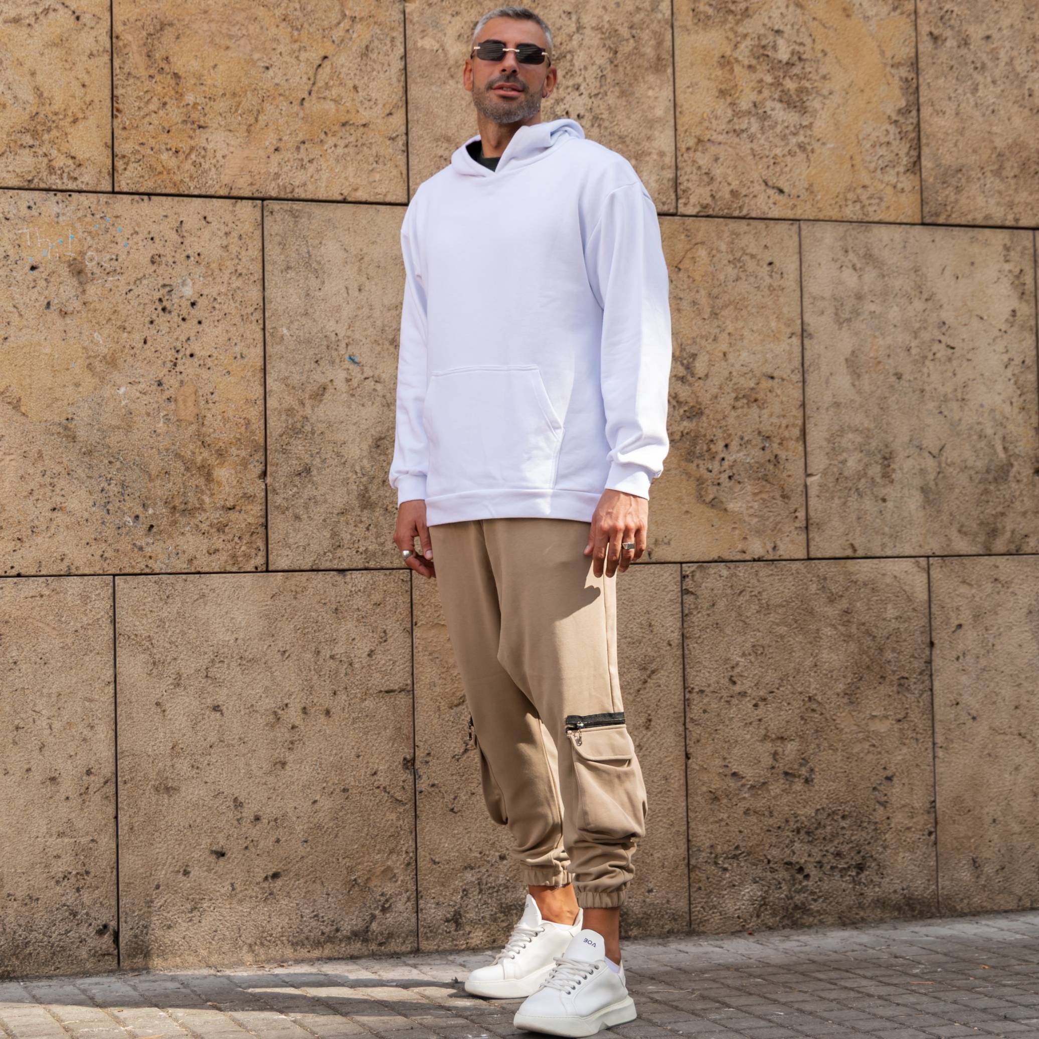 Φούτερ λευκή με κουκούλα με στάμπα σε oversized γραμμή