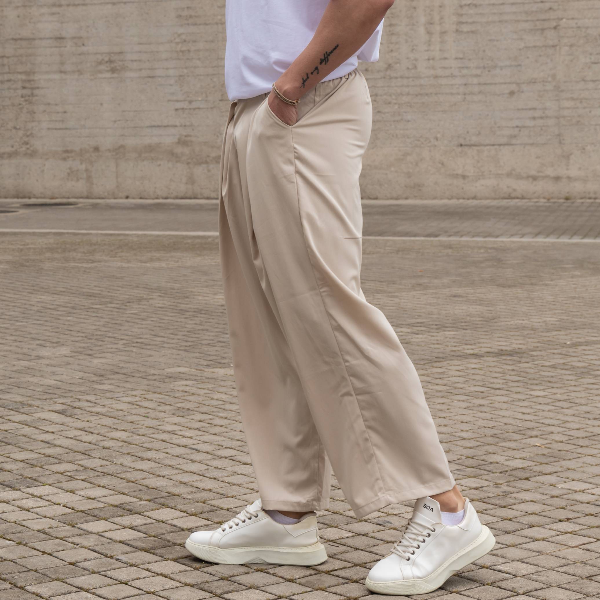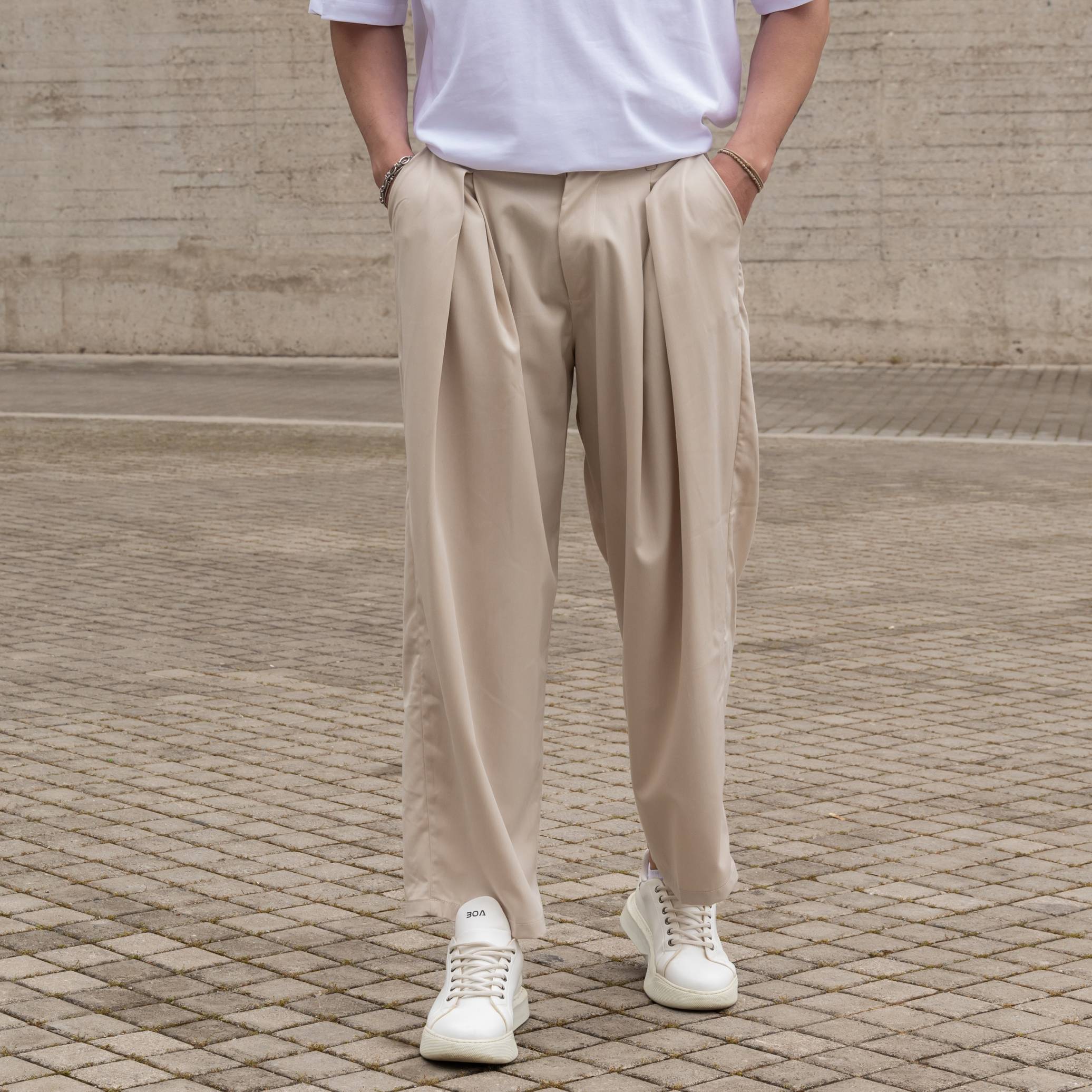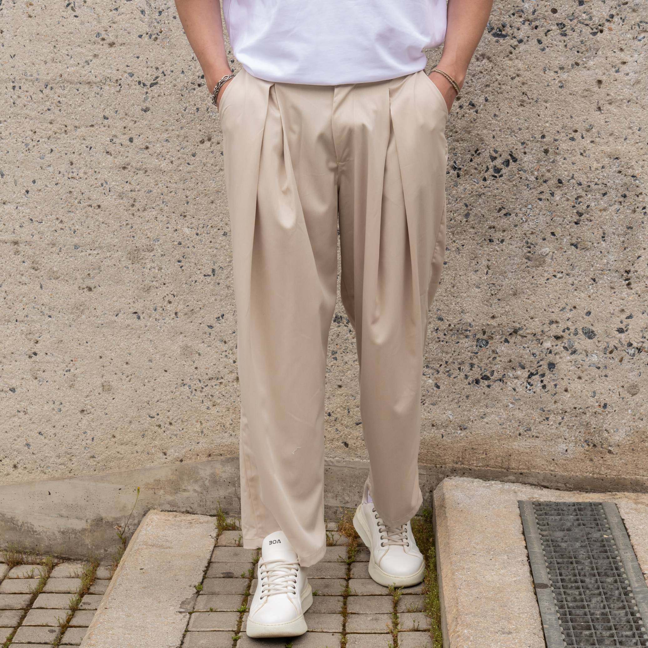 Παντελόνι μπεζ με πιέτες σε άνετη γραμμή