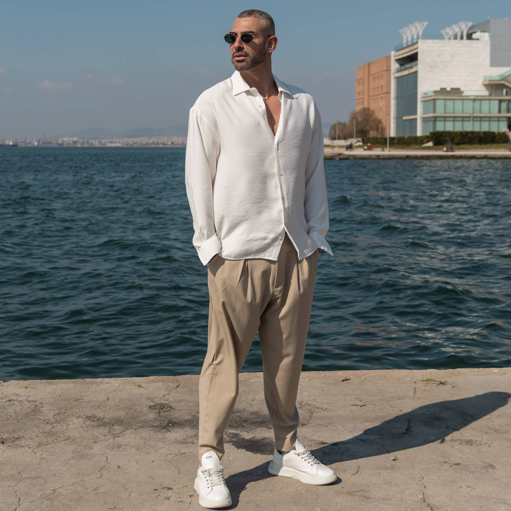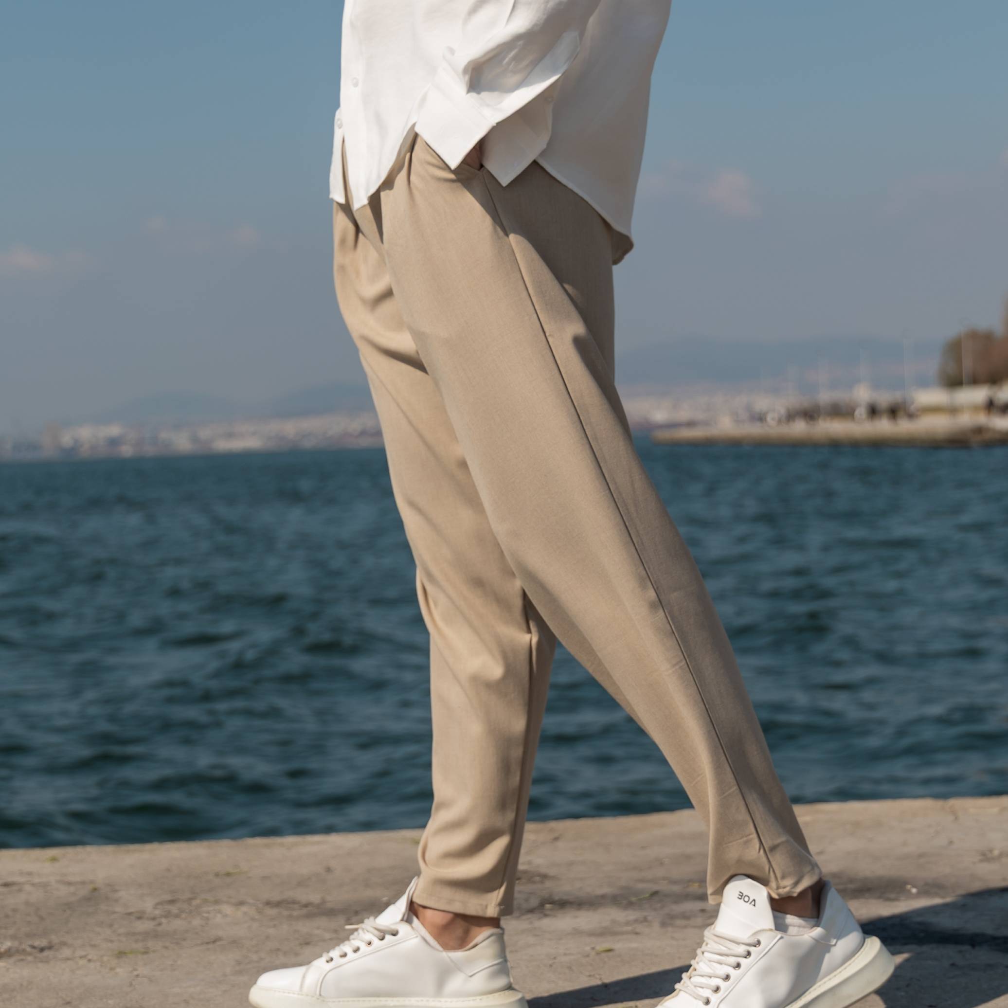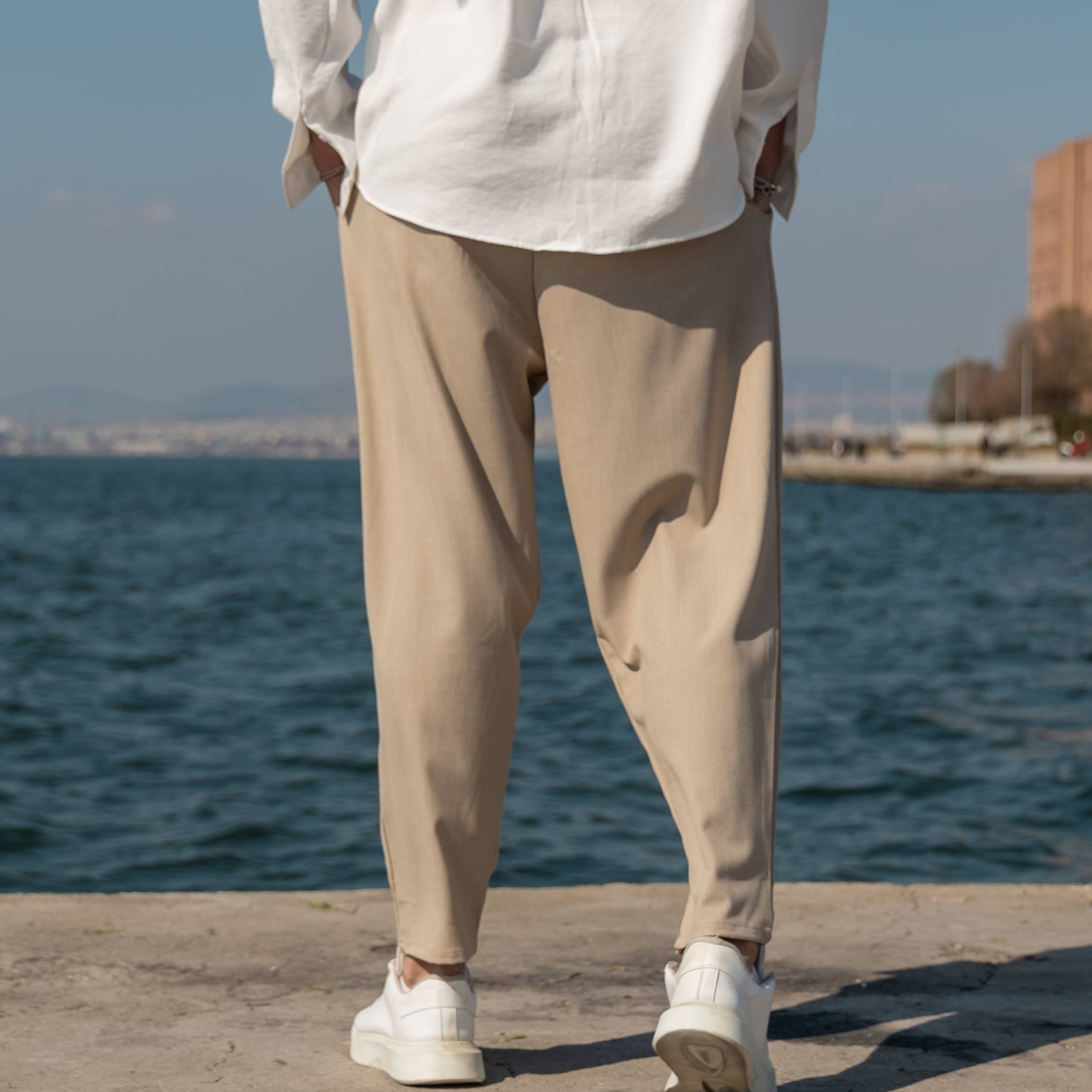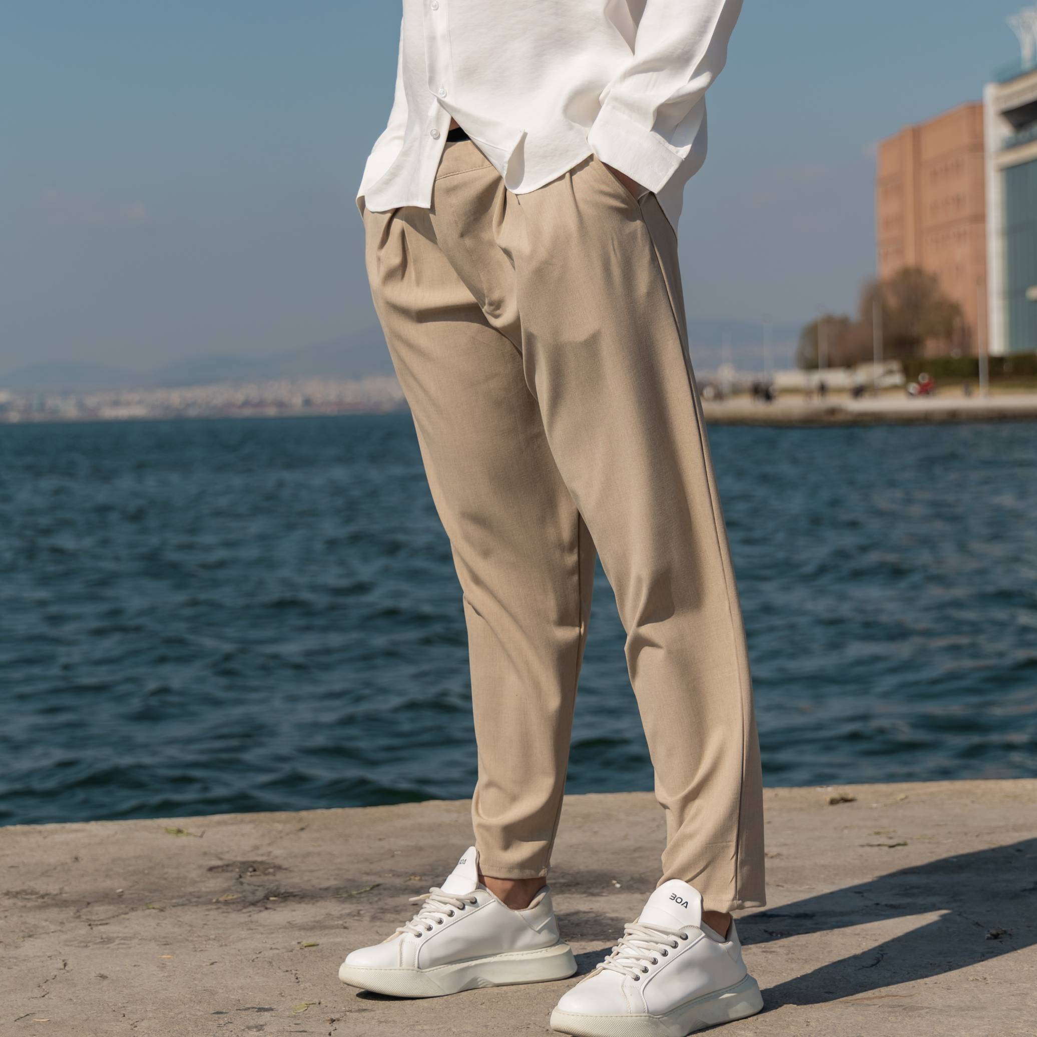 Παντελόνι μπεζ με πιέτες σε άνετη γραμμή