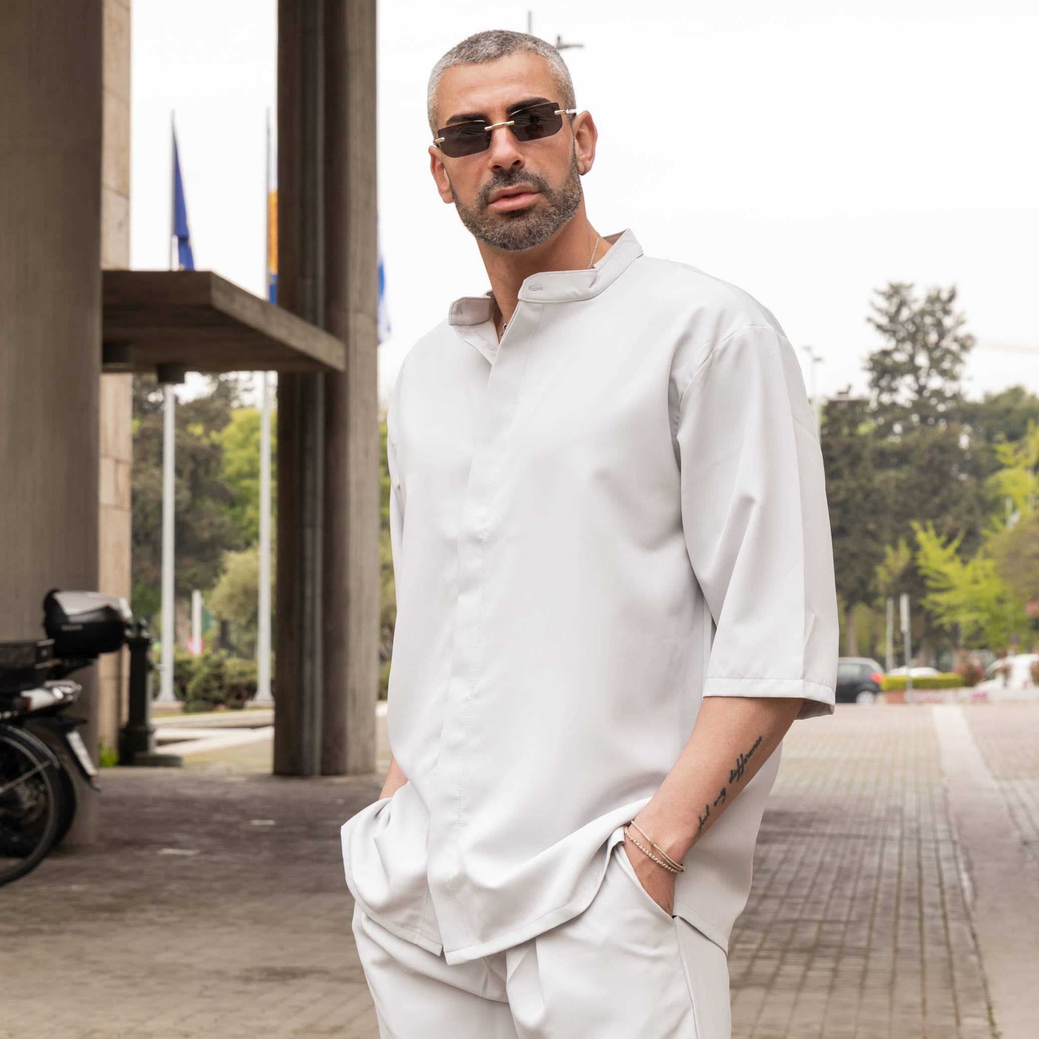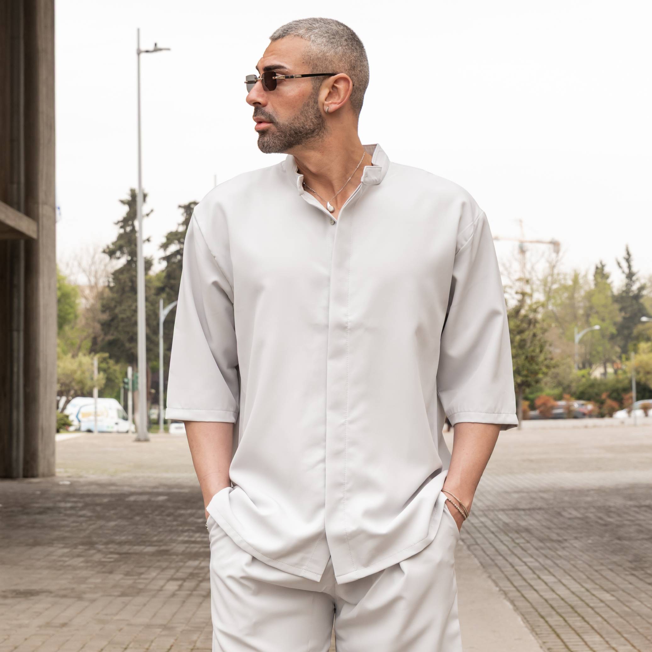 Πουκάμισο γκρι 3/4 μανίκι με βερμούδα σε oversized γραμμή