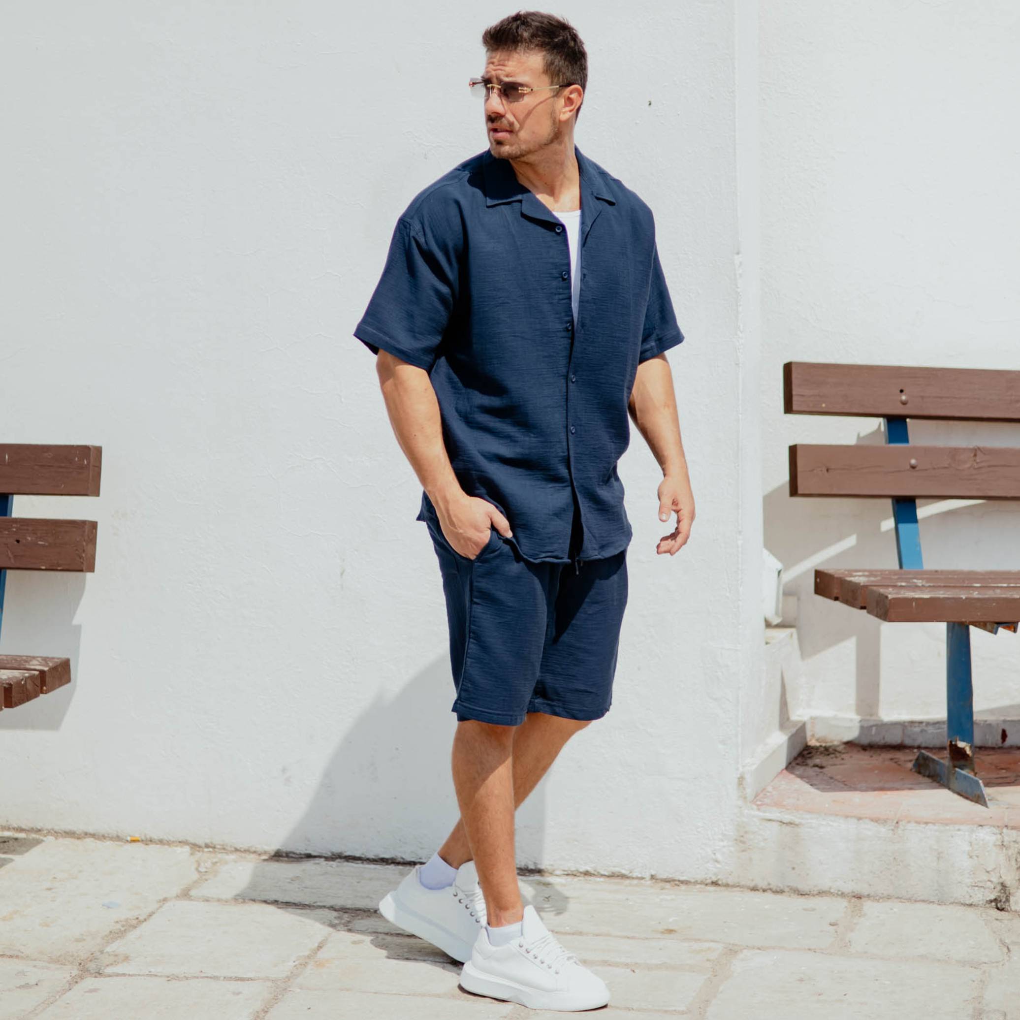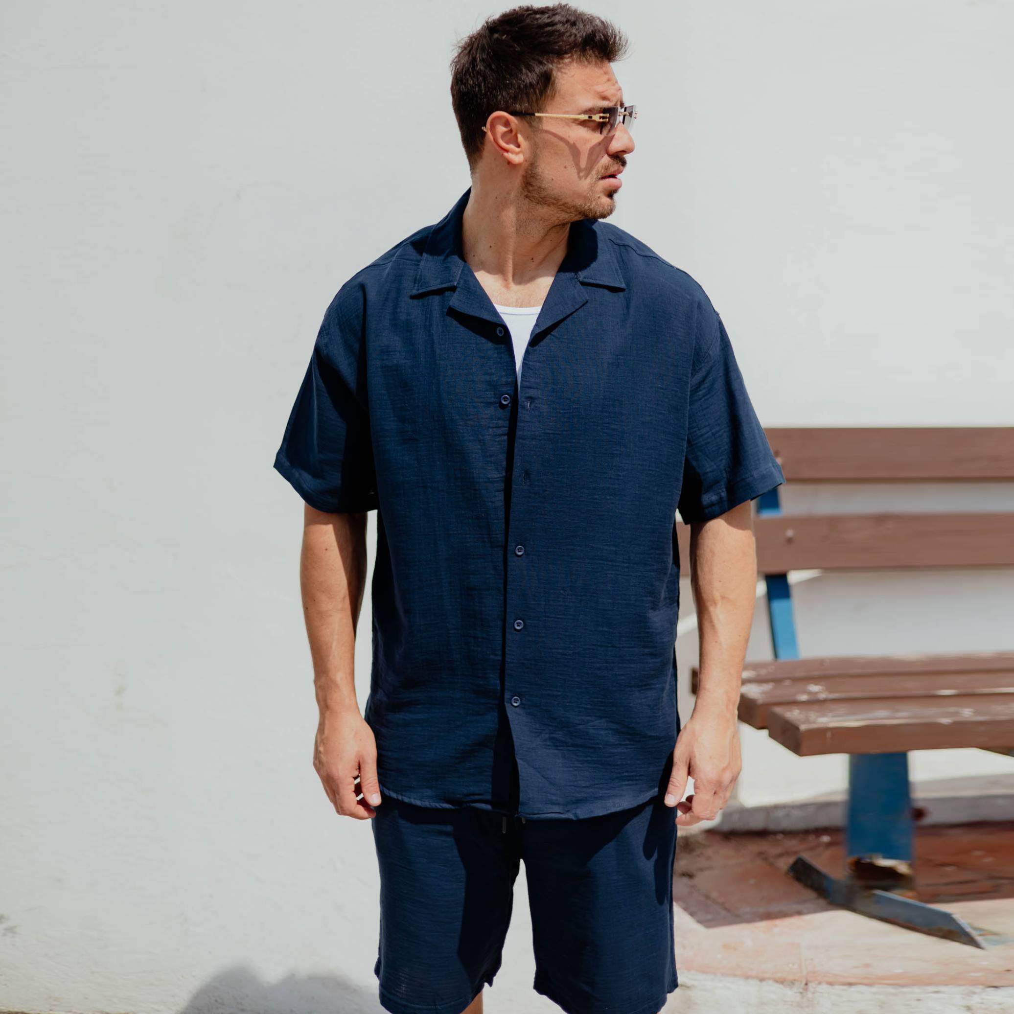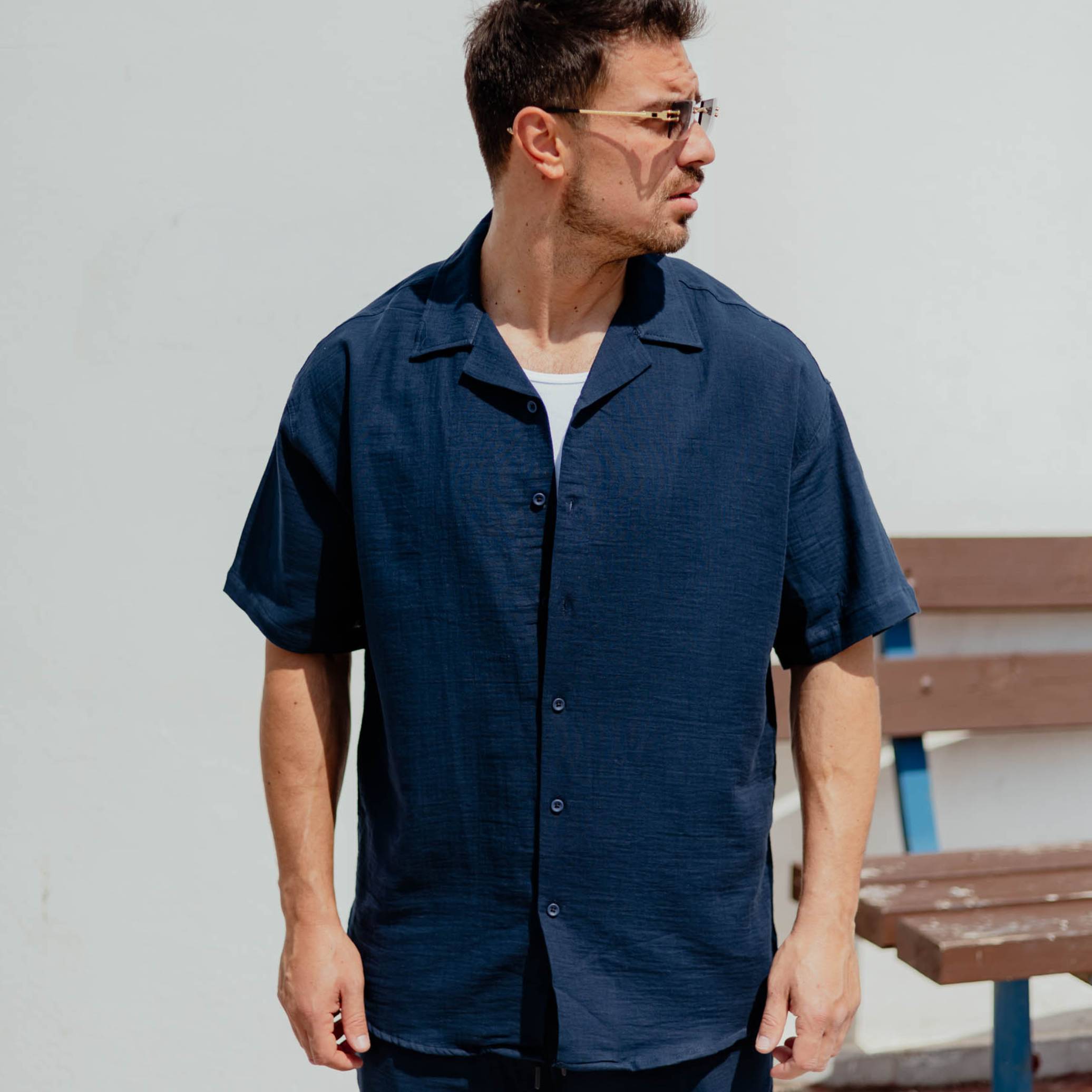Πουκάμισο κοντομάνικο λινό μπλε σε άνετη γραμμή