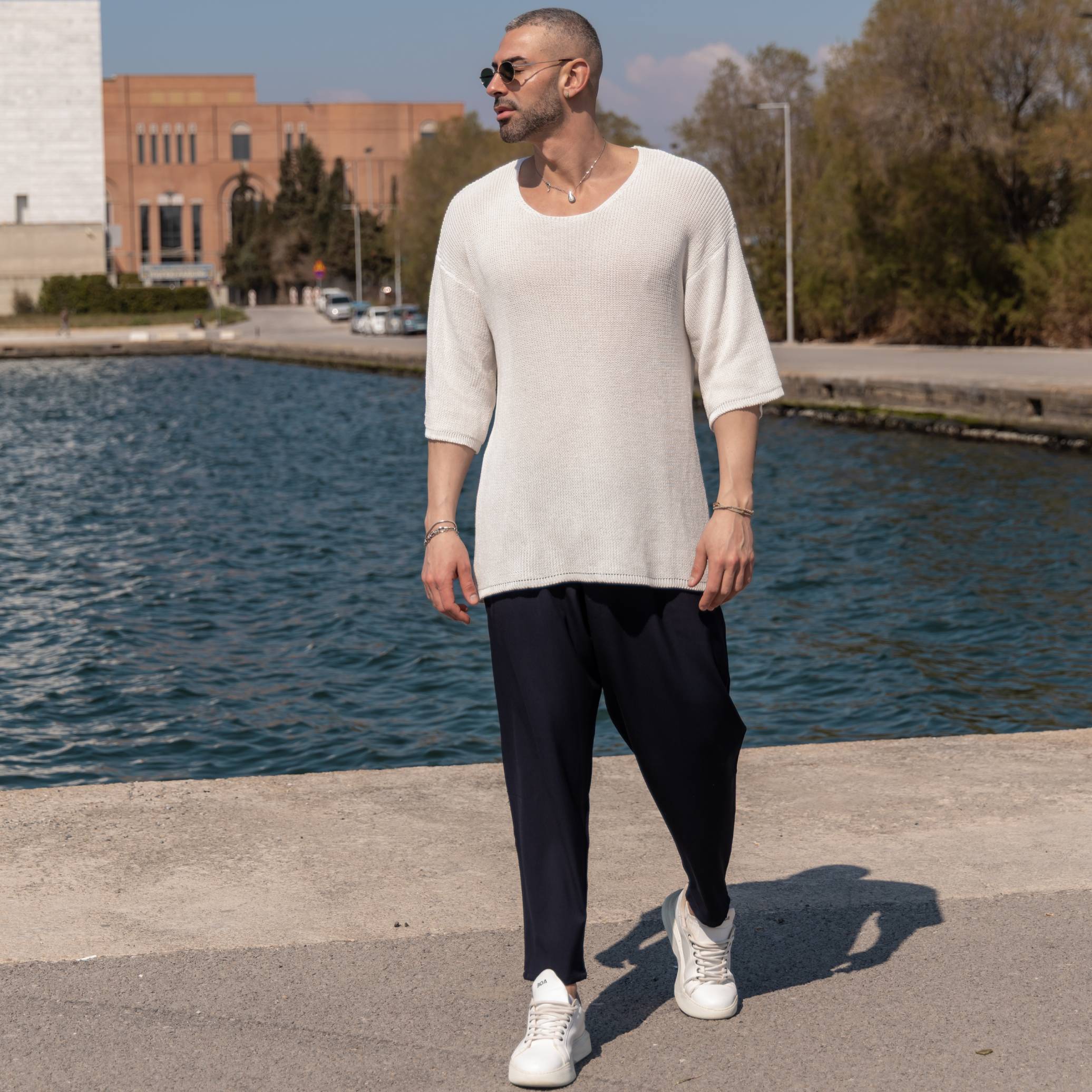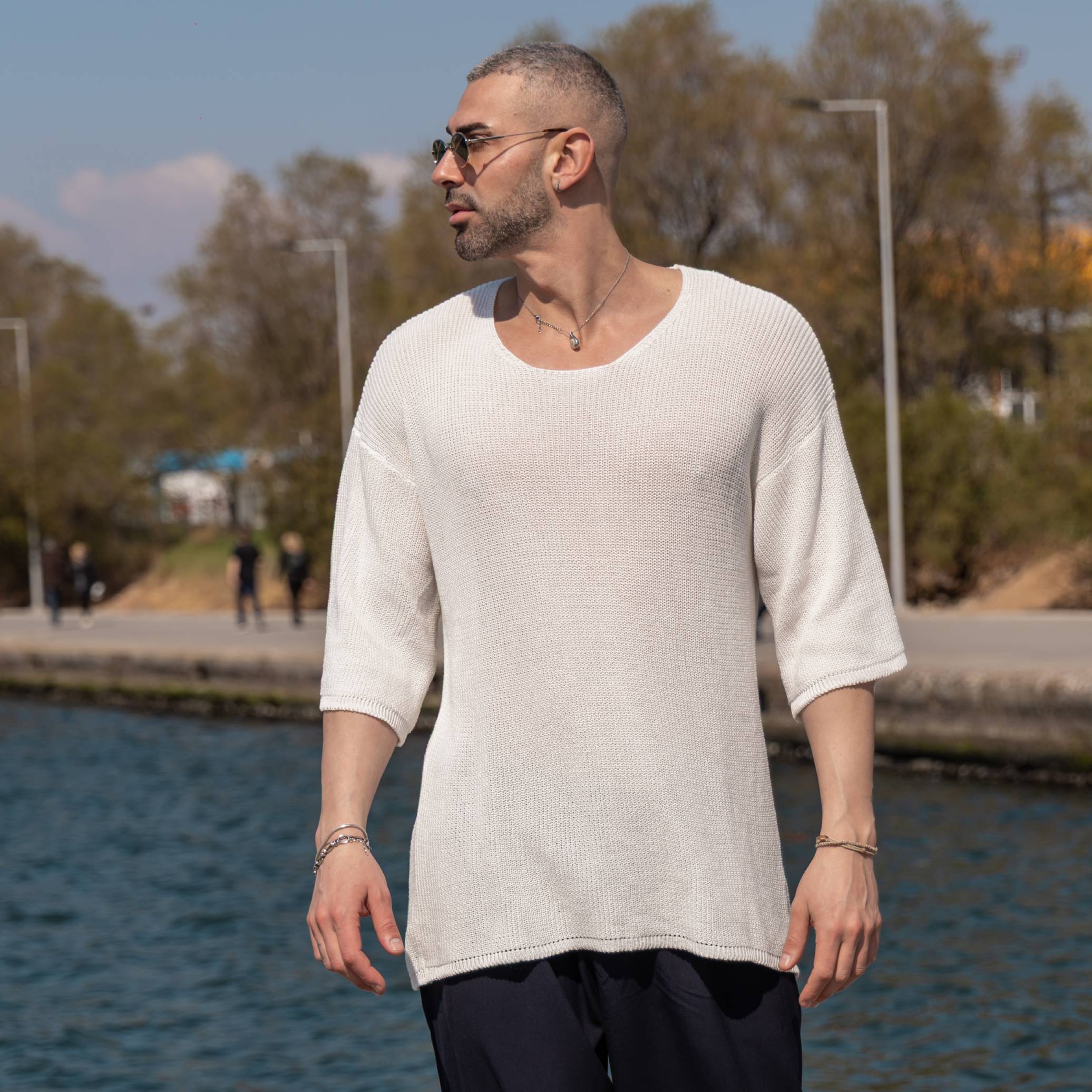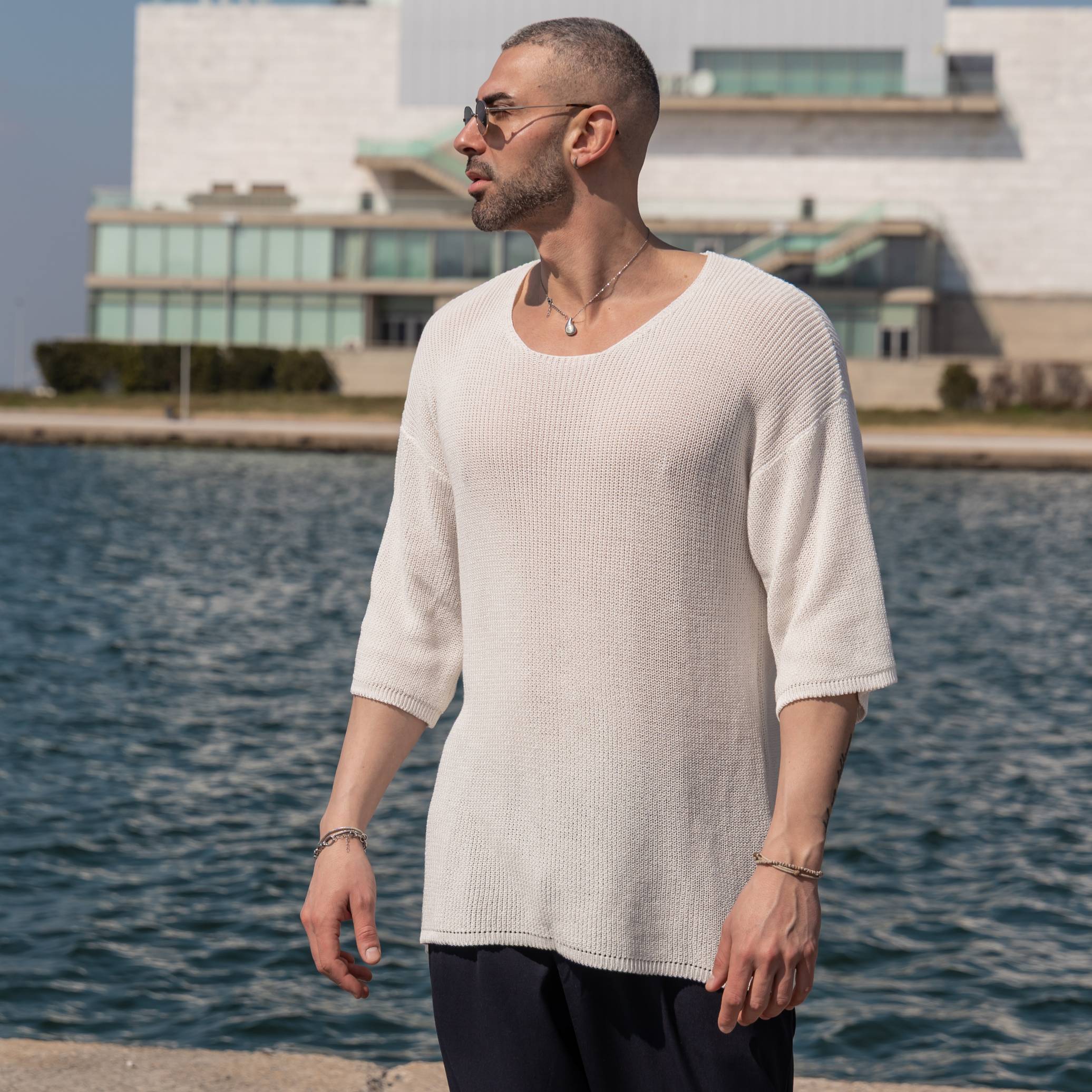 T-shirt μπλούζα λευκή πλεκτή 3/4 σε κανονική γραμμή